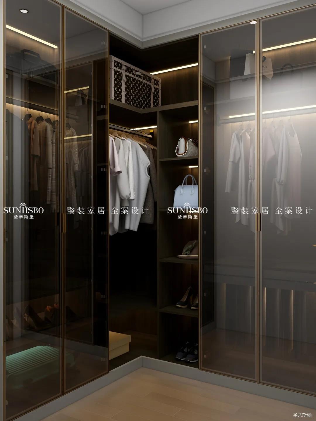 L型衣帽间采用了玻璃与实木组合,用时尚的烟熏色打造纯净质感,避免了全实木柜门的无趣。人性化的分区包含了鞋架、裤架、首饰收纳等,将衣帽间的实用性灵活设计成业主的收纳习惯。